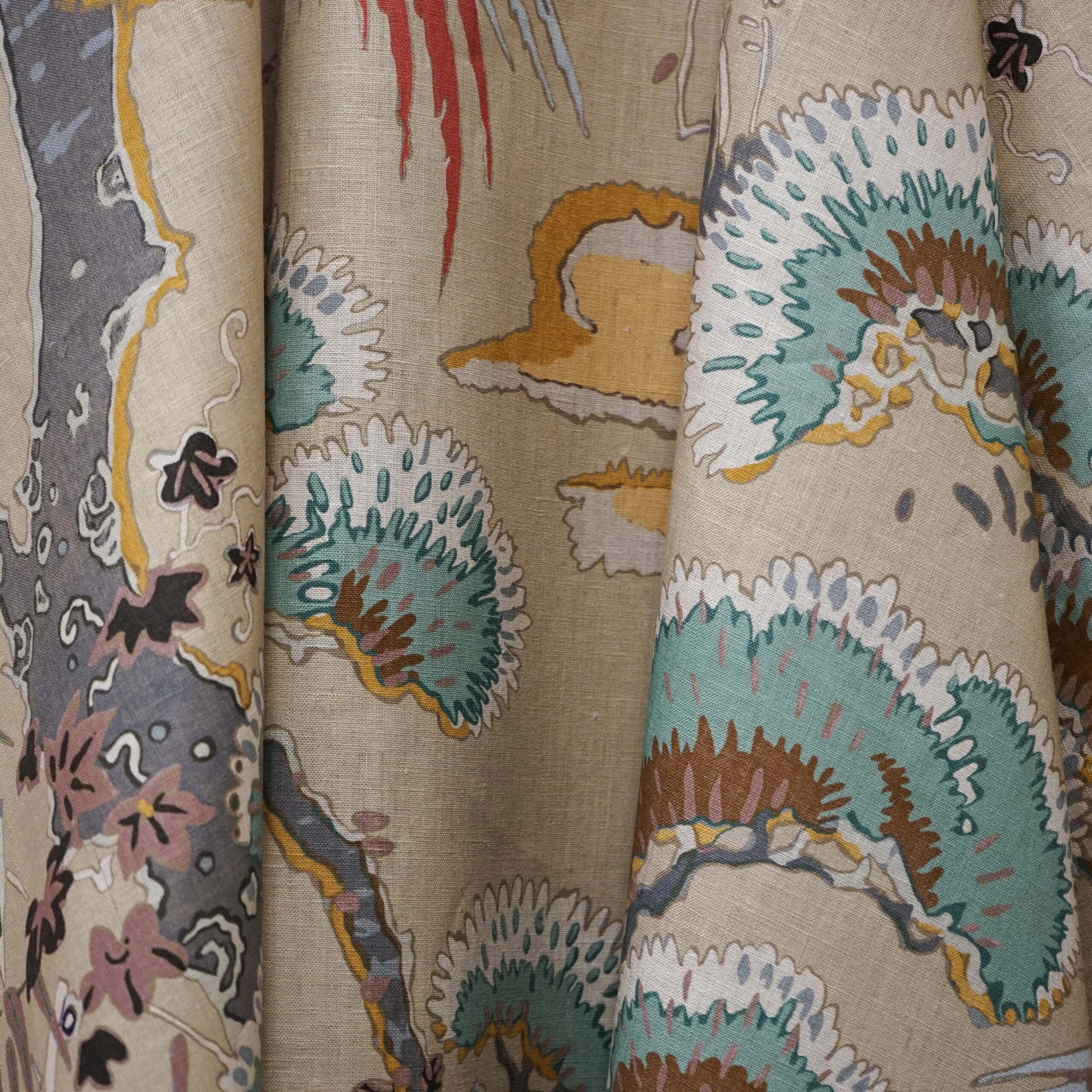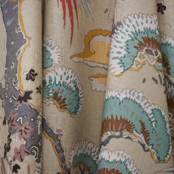 A traditional toile depicting colorful cranes and greenery on a mustard ground, with fine linen slubbing throughout. Features a multitude of colors including tan, pink, blue, taupe, red, grey, teal and gold.