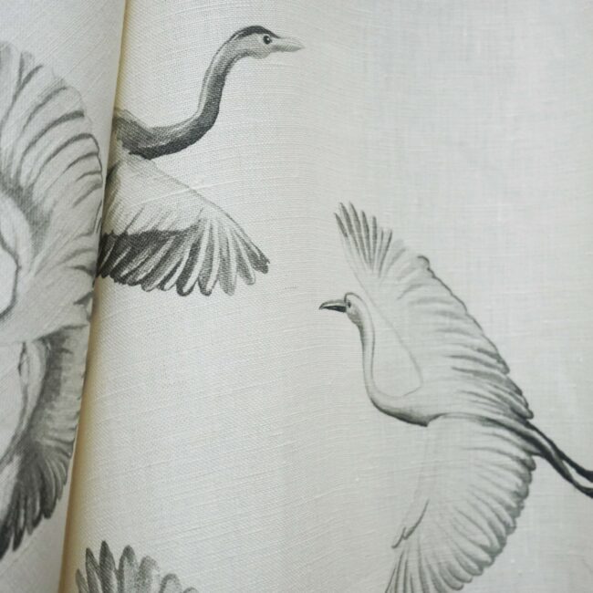 A magnificent grey watercolor crane print on a cream colored 100% linen base cloth.