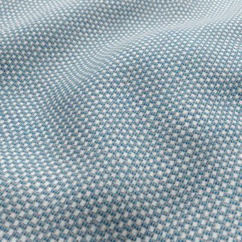 An intricately woven indoor/outdoor performance upholstery fabric, in an aqua blue and white coloration. Finished with FibreGuard Outdoor stain free technology for easy maintenance. Ideal for both residential and contract usage.