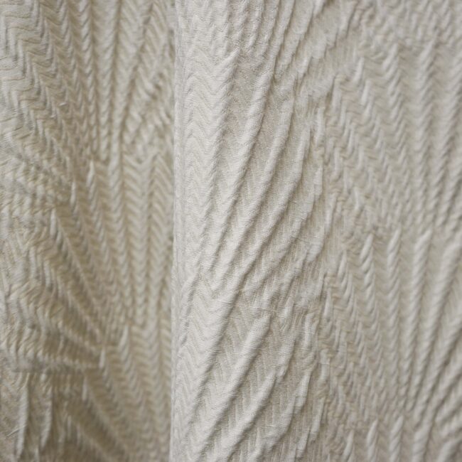 Large scale monochromatic seashell patterns with a wave detailing runs throughout the fabric in a tone-on-tone beige.