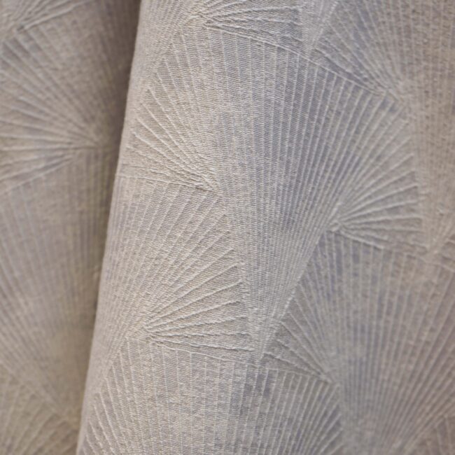 An elegant, light-weight fabric displaying multiple triangles creating an optical appearance. Pattern can be used with fan-like shapes going both upwards or down. Features a smoky grey and ivory patina throughout.