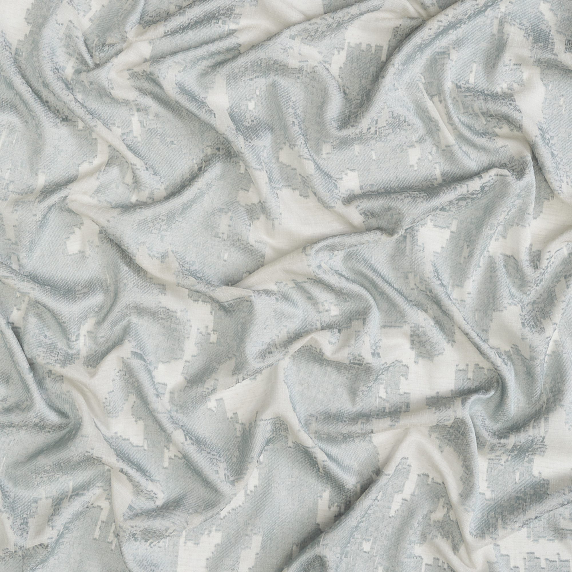 Large abstract textural design woven on wide width sheer fabric. A blue, turquoise, ivory coloration.