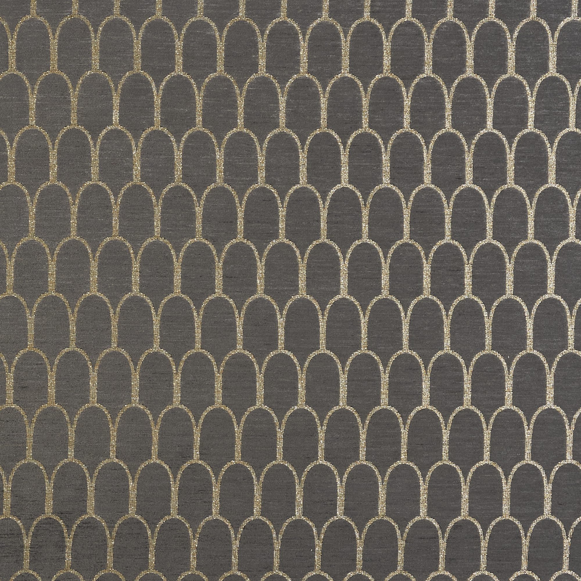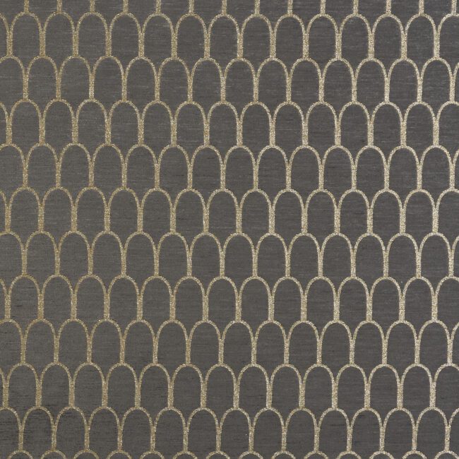 A high performance chenille fabric with a metallic woven scallop pattern and Crypton Home finish, making it both a beautiful and easy care option for residential or contract spaces. A charcoal, grey, gold coloration.