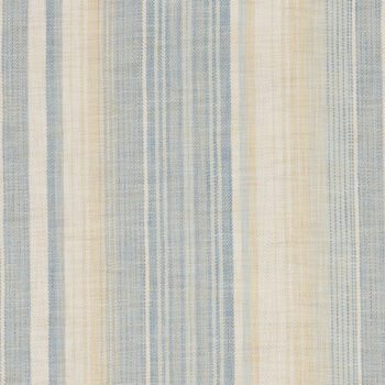 A lively, woven striped drapery fabric in shades of blue and beige.