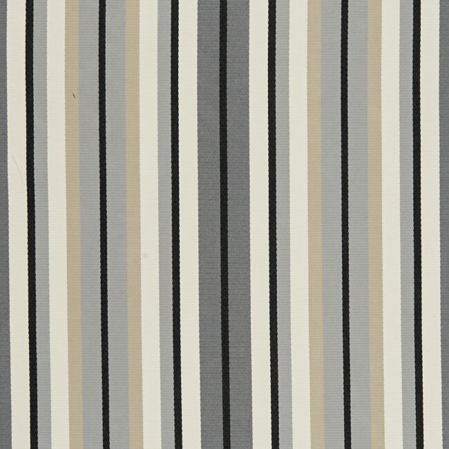 A classic awning stripe design on an indoor/outdoor jacquard performance fabric. In shades of gray, taupe, cream and black coloration. Ideal for both residential and contract usage.
