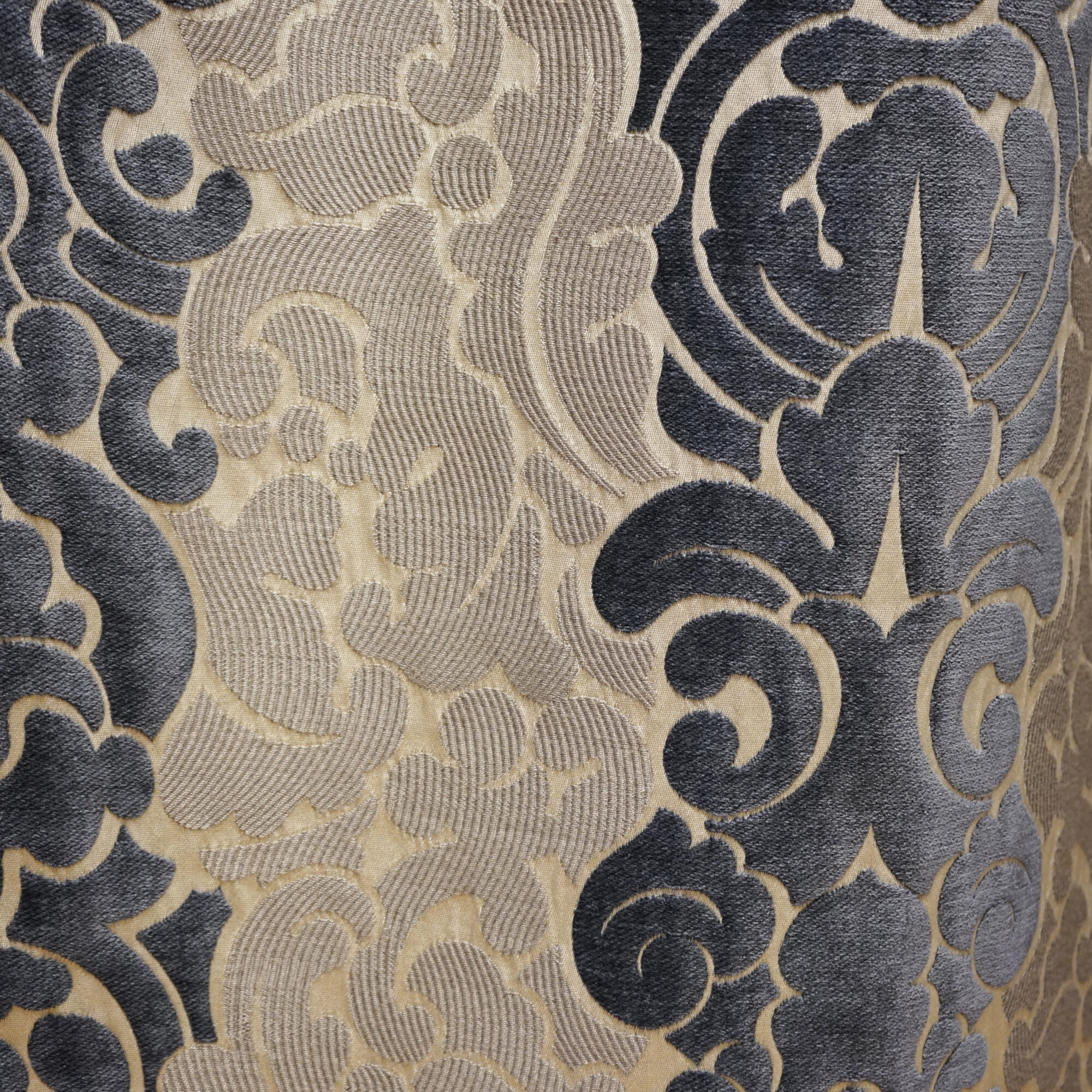 Lucera is a modern spin on a traditional damask striped pattern. This pattern features a velvet damask in a steel gray paired with a woven classic gray damask. Lucera is perfect for drapery and accessory use.