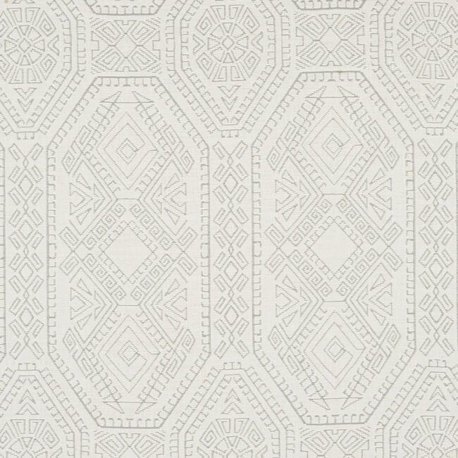 A Navaho inspired textured woven jacquard fabric with a Crypton Home finish. Background in a cream with design in gray coloration.