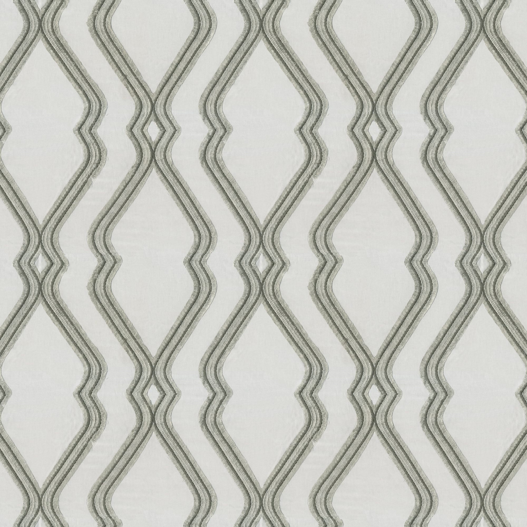 Eye catching large ogee design embroidery with eyelash edging, this fabric will be the focal point of any room. Yarns in light to dark grey hues on a white sateen base cloth.