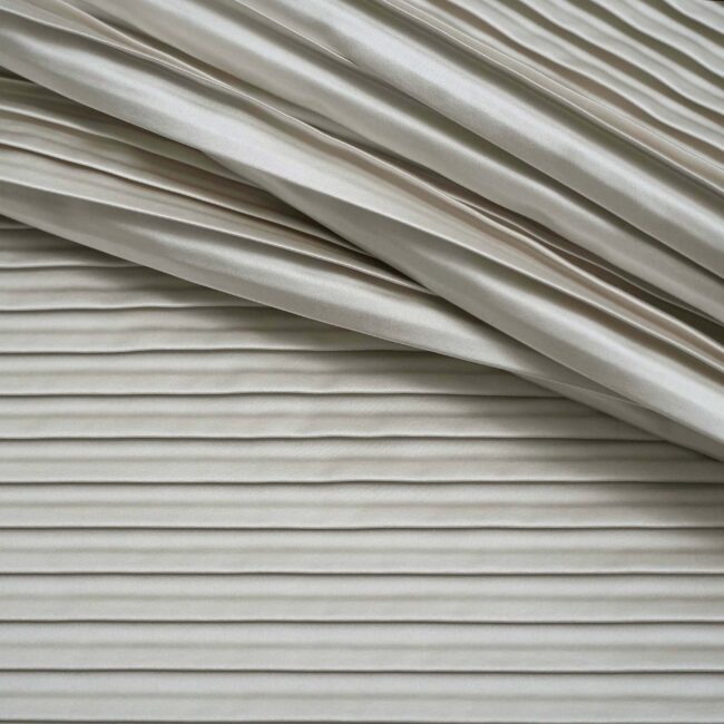 A soft and silky, pleated sateen fabric. A light cream coloration. The coordinating non-pleated plain is Whisper 192J9021.