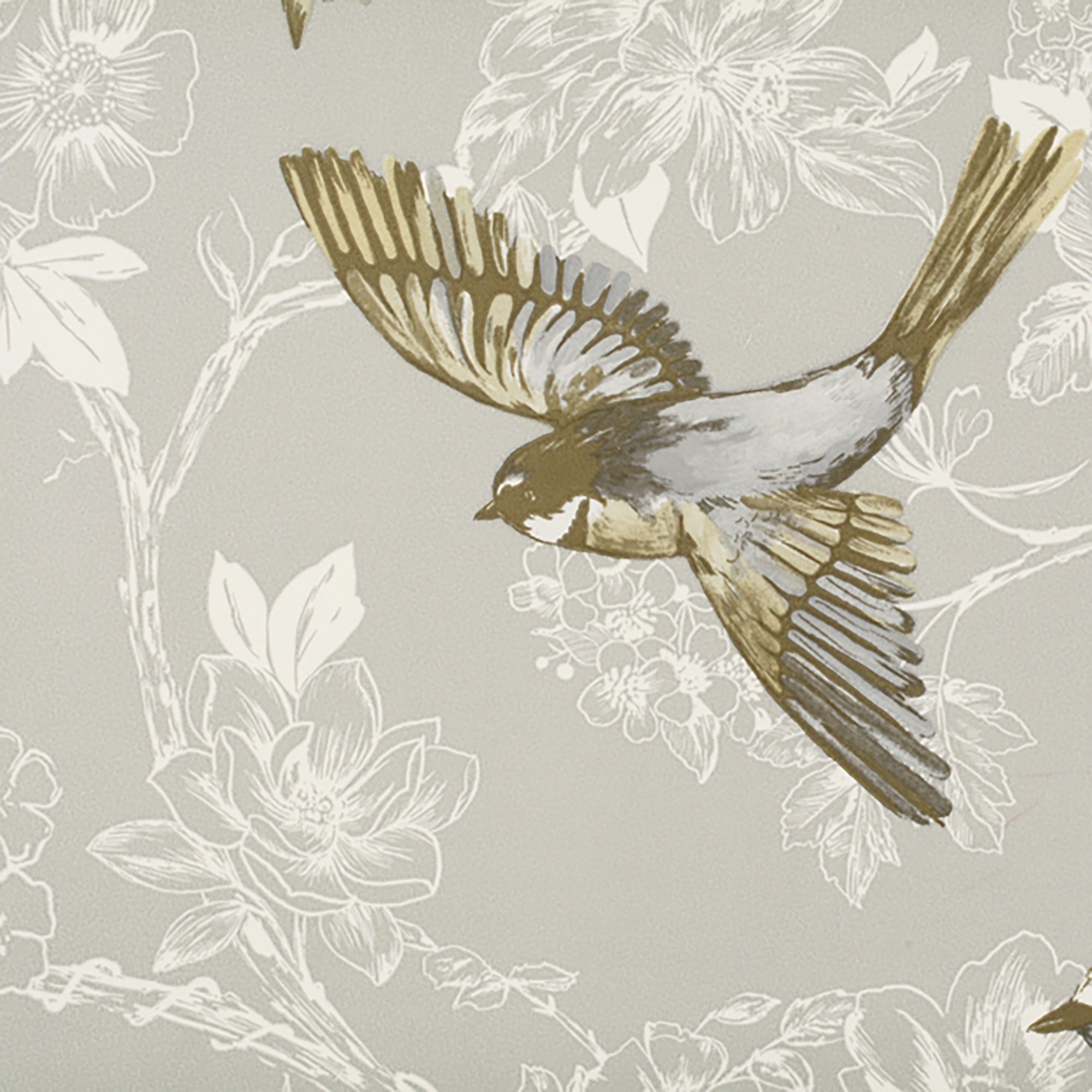 Traditional floral vine design wallpaper in neutral tone of ivory on a gray ground with light blue and beige songbirds in flight and perched on a branch.