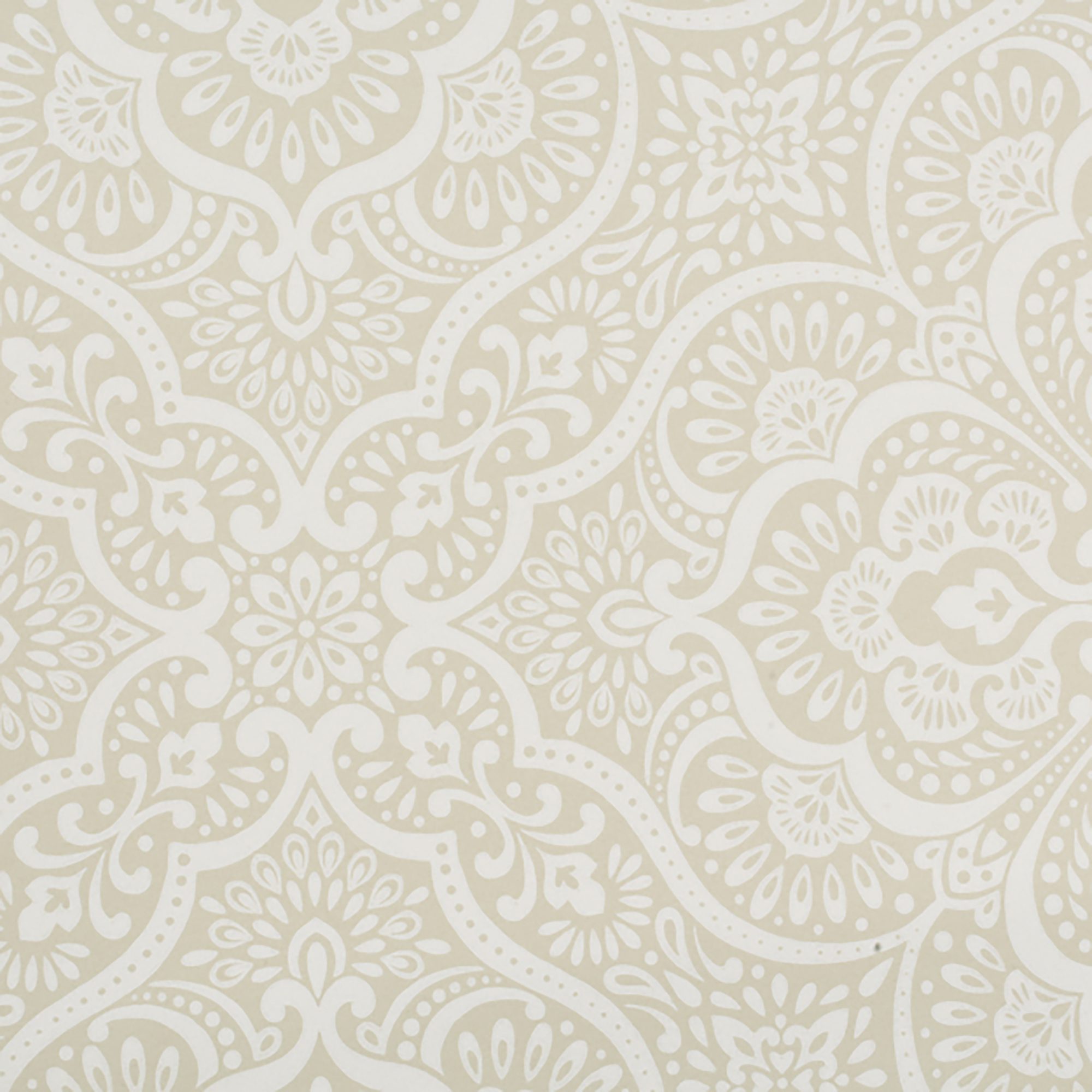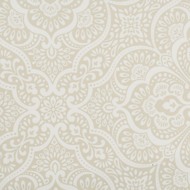 A damask medallion pattern wallpaper, beige ground with design in white.