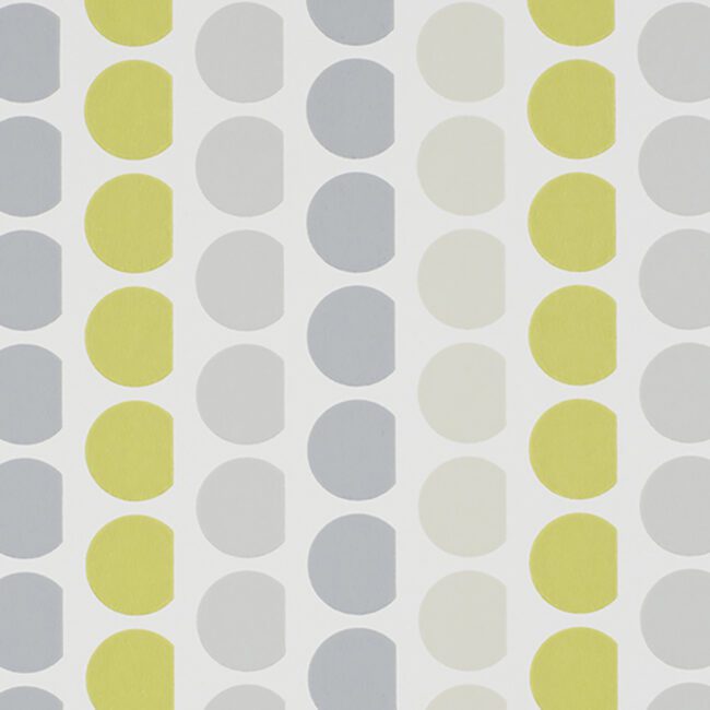 Circles and stripes design, a cream background with hues of lime green, sage and gray coloration of circles lined up creating a stripe make up this fun wallpaper.