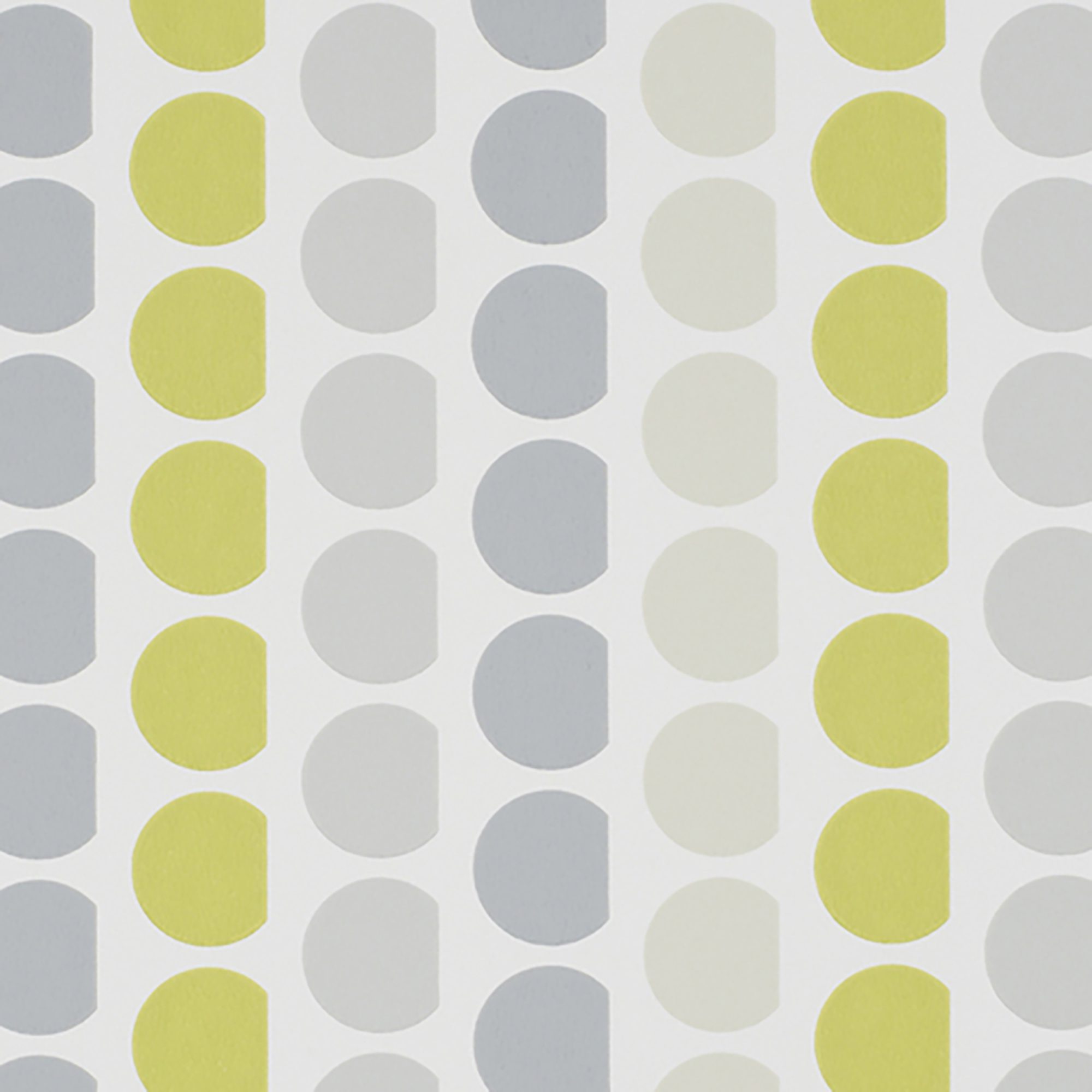 Circles and stripes design, a cream background with hues of lime green, sage and gray coloration of circles lined up creating a stripe make up this fun wallpaper.