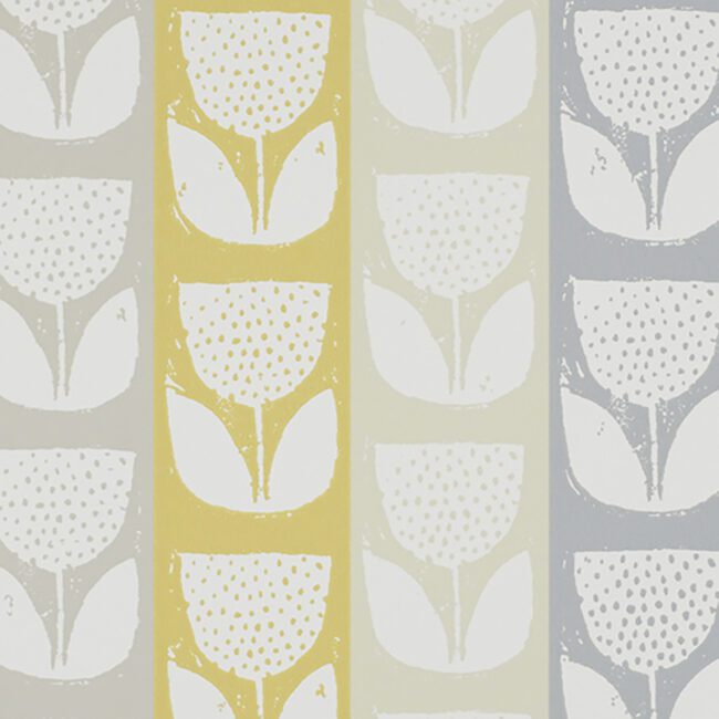 A stamped spotted cream tulip design wallpaper on alternating wide stripes in hues of metal gray, beige and mustard yellow coloration.