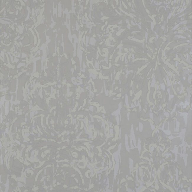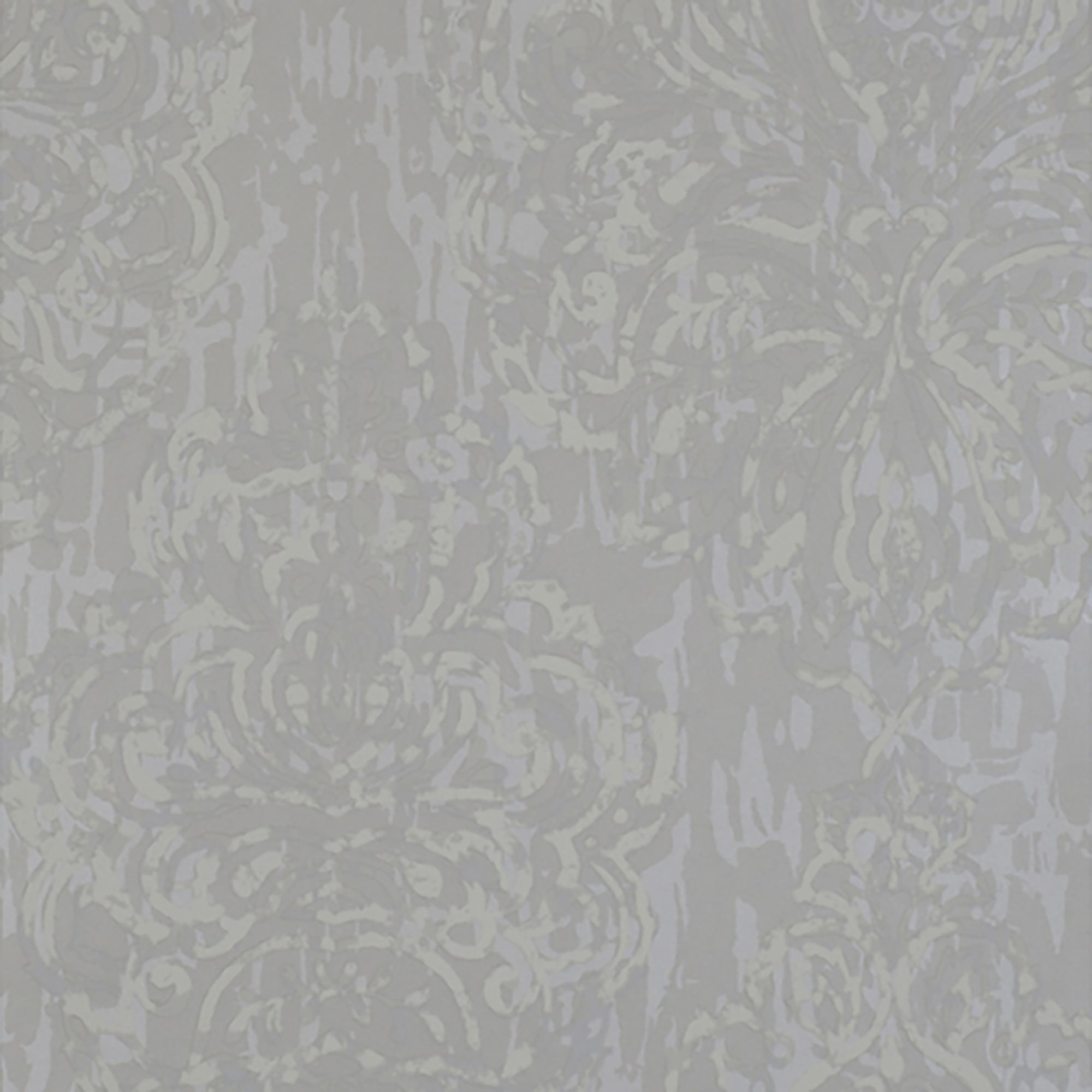 Large scale abstract medallion damask design wallaper, in hues of champagne and metallic silver coloration.
