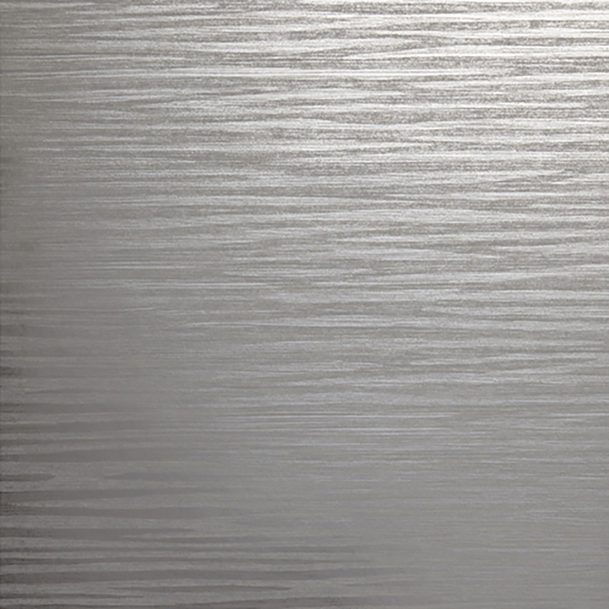 A horizontal striae stripe foil wallpaper. In shimmering taupe and silver coloration.