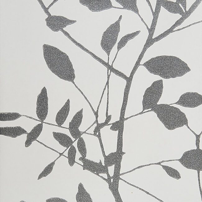 Give your room a feeling of tranquility with this opuent silver metallic leaf design, on a matte finish soft gray ground.