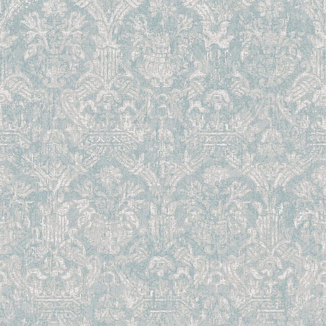 This wallpaper features a beautiful muted damask pattern in a shimmering white on a soft turqoise backing.