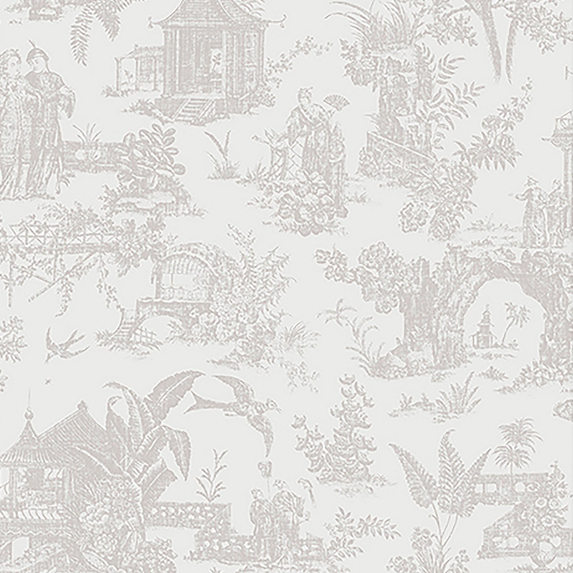 This oriental toile wallpaper is featured in a light gray on a white backing.