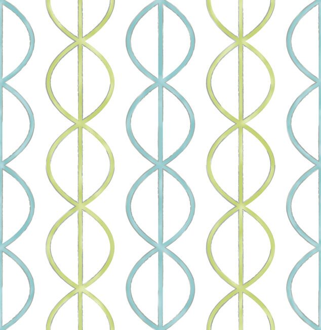 A chainlink design wallpaper with a contemporary flair. In hues of light teal blue and lime on an ivory ground.