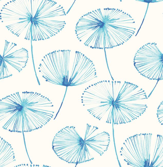 A floating abstract dandelion design wallpaper with a contemporary flair. In hues of teal blue on an ivory ground.