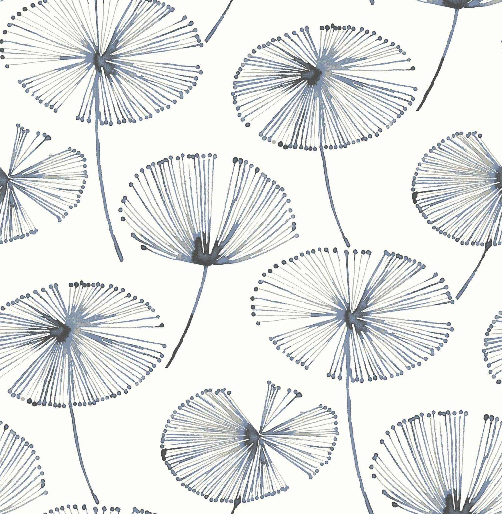 A floating abstract dandelion design wallpaper with a contemporary flair. In hues of blue and grey on an ivory ground.