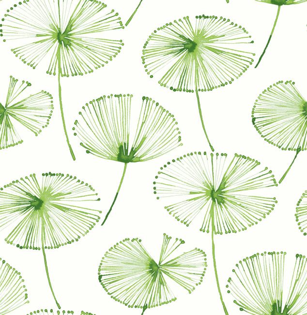 A floating abstract dandelion design wallpaper with a contemporary flair. In hues of kelly green on an ivory ground.