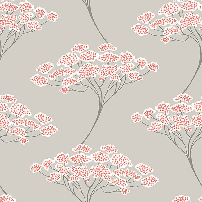Update your walls with this unique tree wallpaper. Beautiful banyan motifs pop in white and coral. Metallic grey trunks add a slight shimmer.