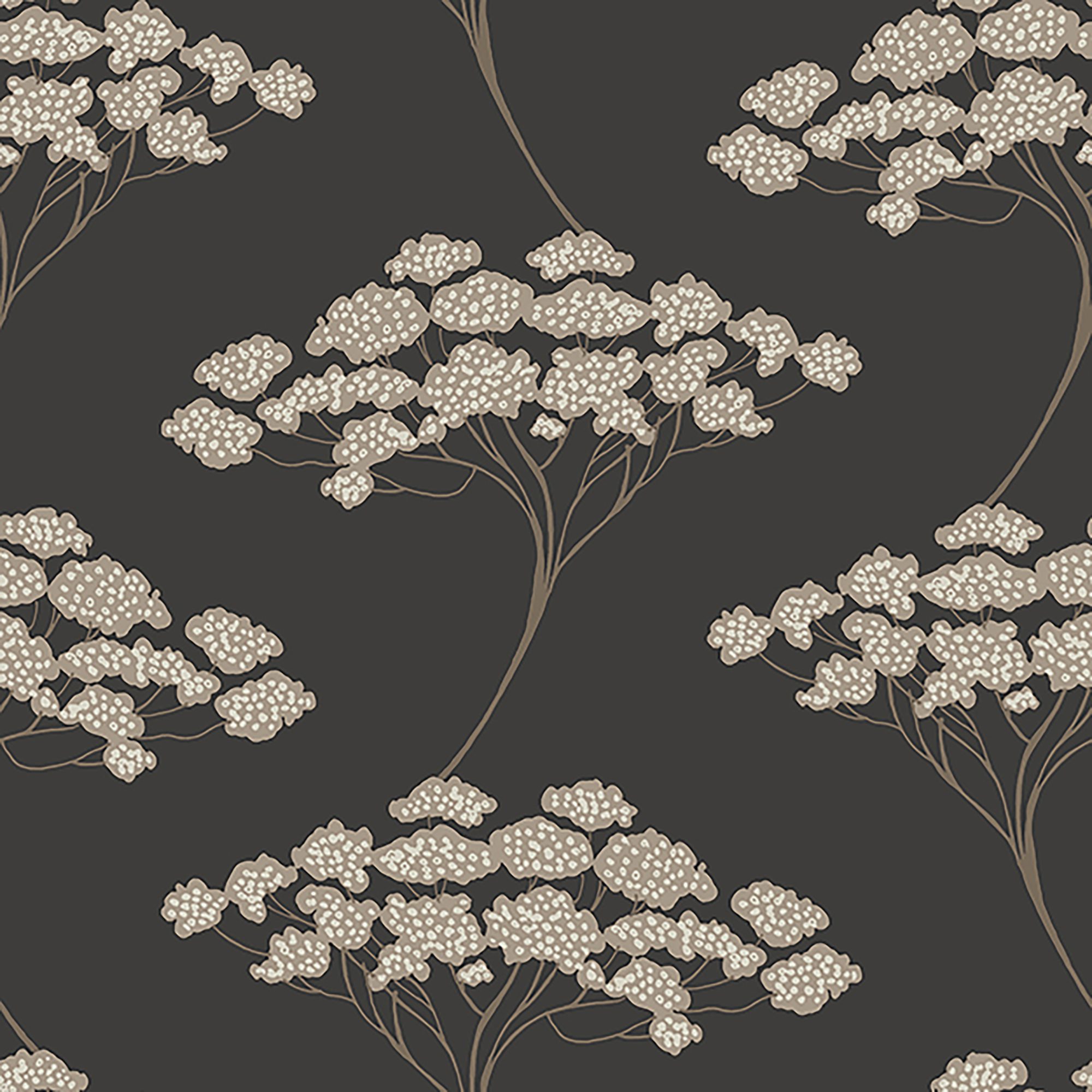 Embrace the beauty of the natural world with this black wallpaper. The bold tree design pops against the dark background in a taupe and gold.