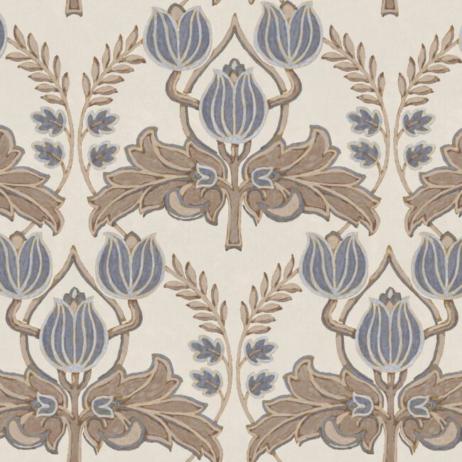 A modern floral damask wallcovering in tones of dusty blue, and monochromatic greiges.