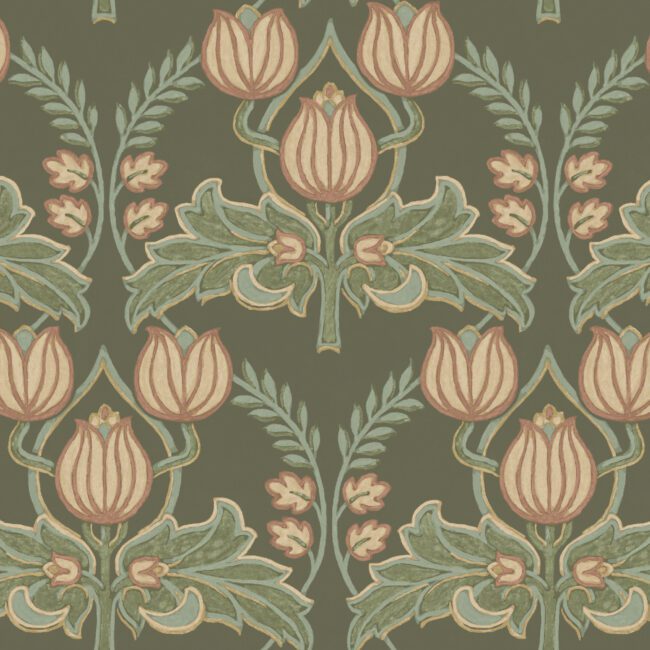 A modern floral damask wallcovering in tones of dark olive green, sage, clay, copper and beige.