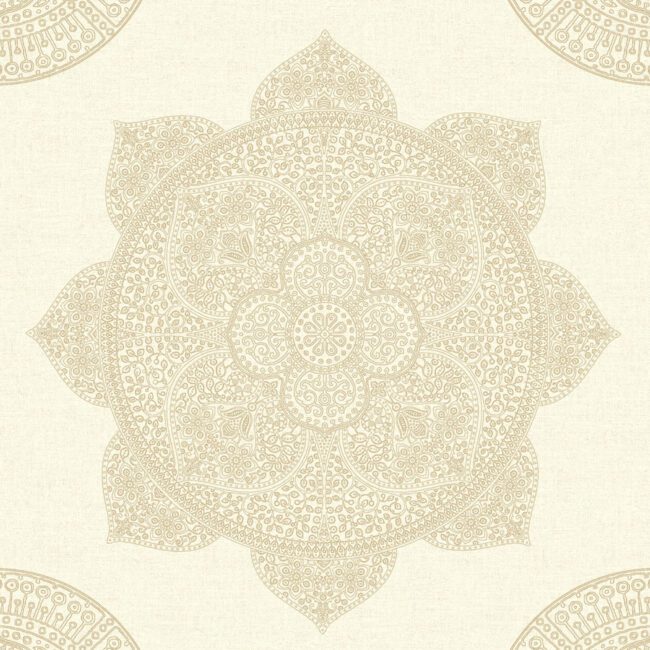 Oversized metallic medallion printed wallpaper. Metallic print on a buttercream yellow ground.