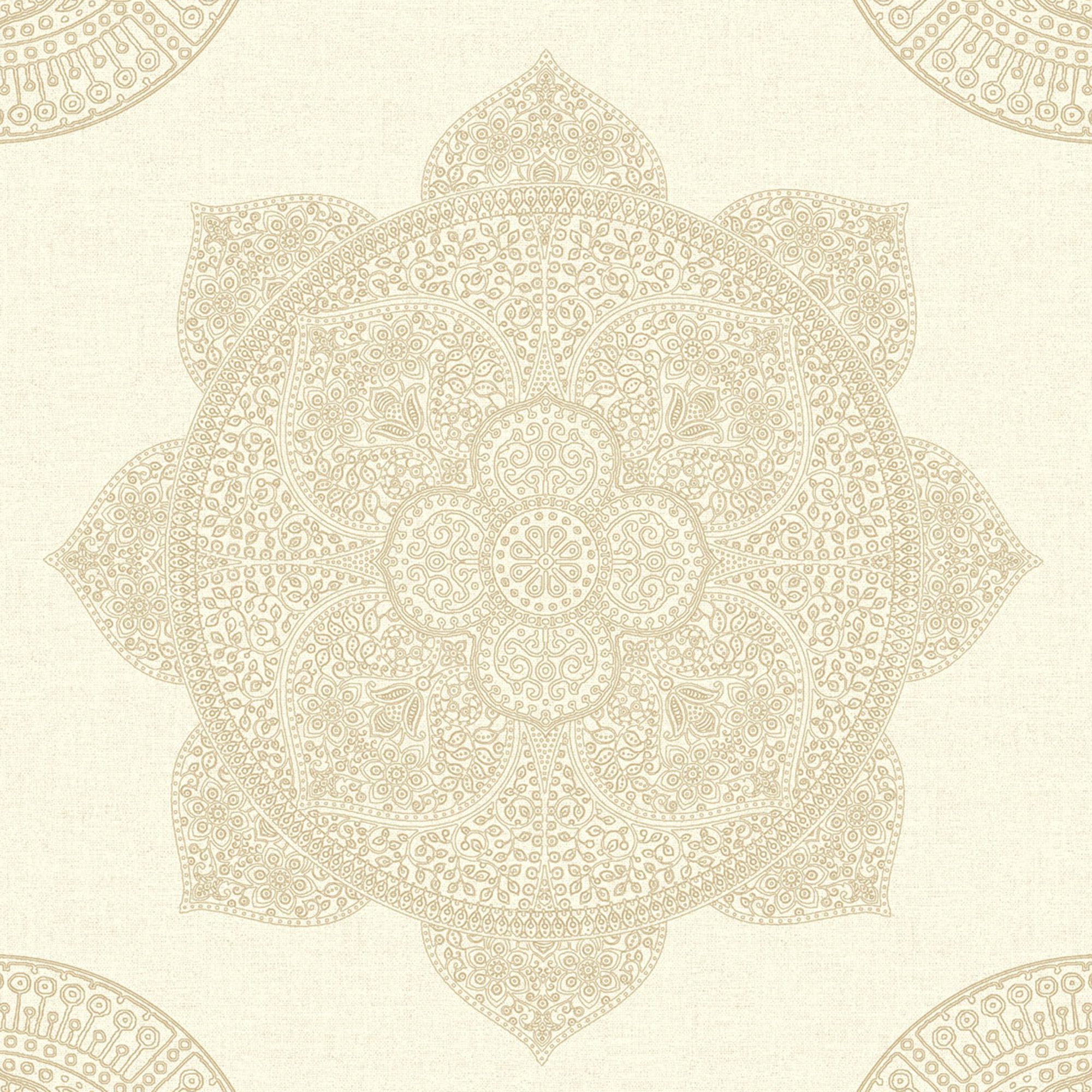 Oversized metallic medallion printed wallpaper. Metallic print on a buttercream yellow ground.