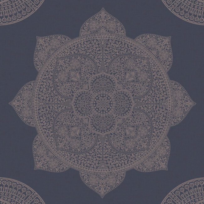 Oversized metallic medallion printed wallpaper. Metallic copper print on a deep indigo ground.