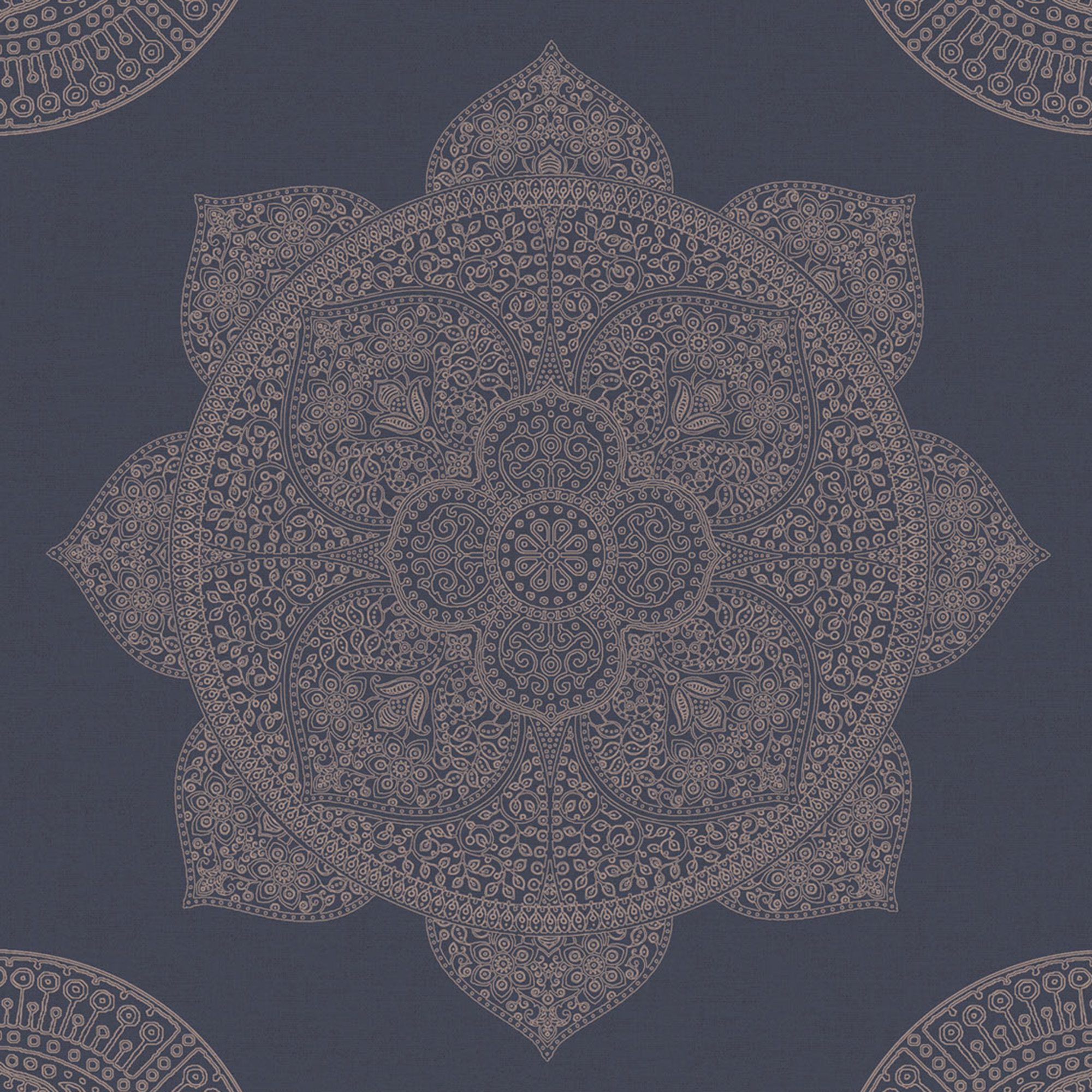 Oversized metallic medallion printed wallpaper. Metallic copper print on a deep indigo ground.