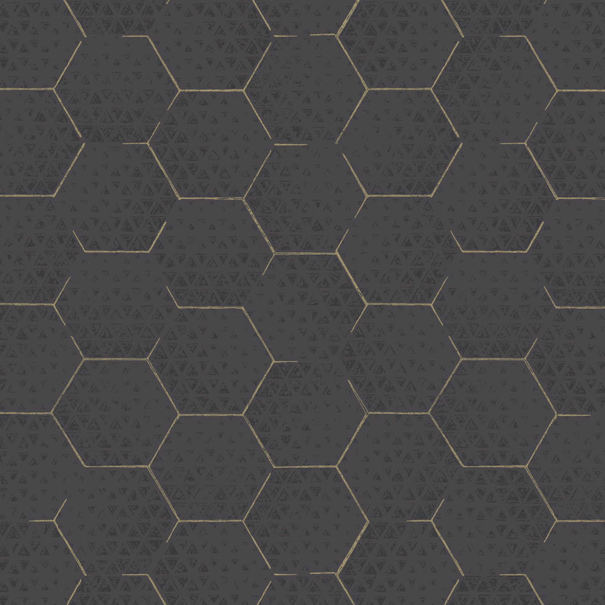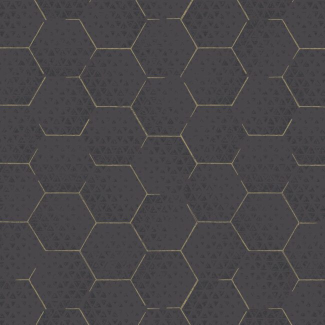 Honeycomb patterned wallpaper. Black ground with gold metallic design.