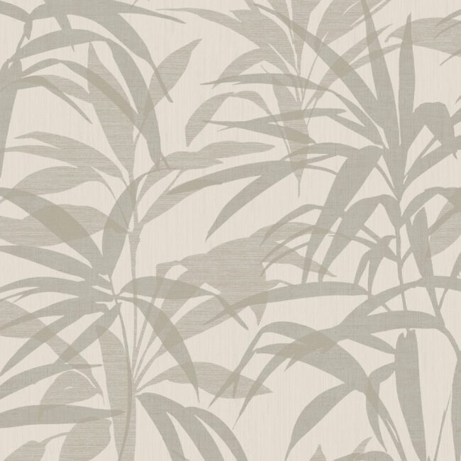 An exotic bambo leaf wallpaper with shimmering silver metallic leaves on a dove gray ground.