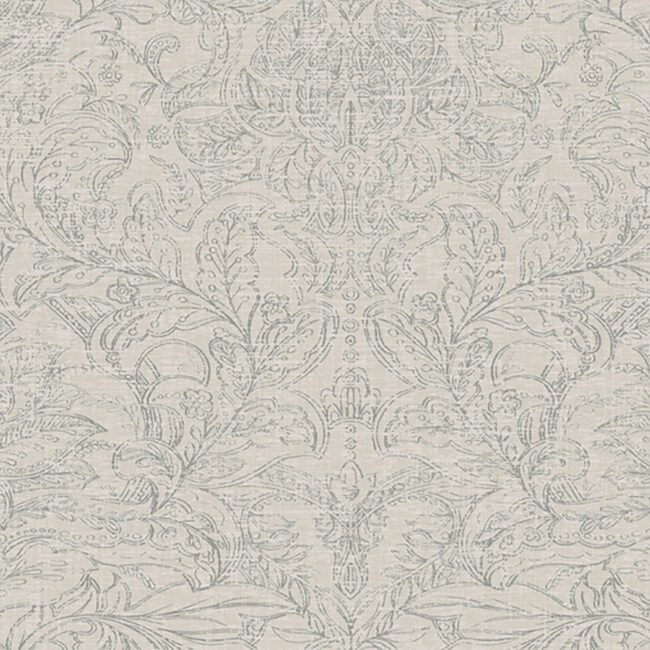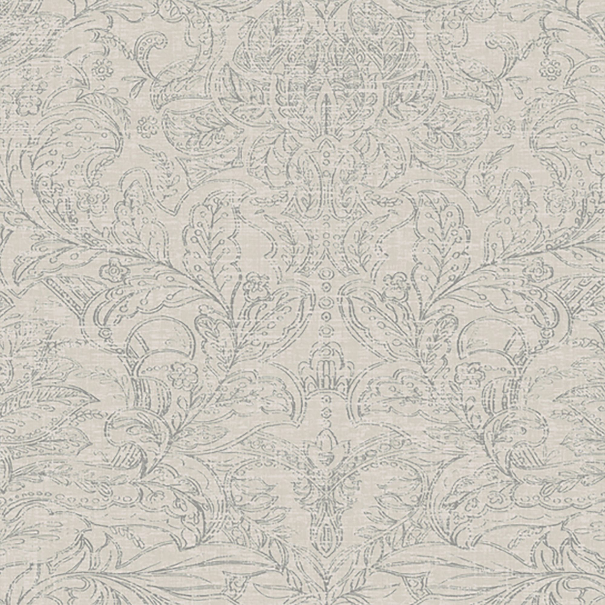 This textured wallpaper features a rich damask pattern in a steel gray with tones of soft gray and a hint of gold throughout the background.