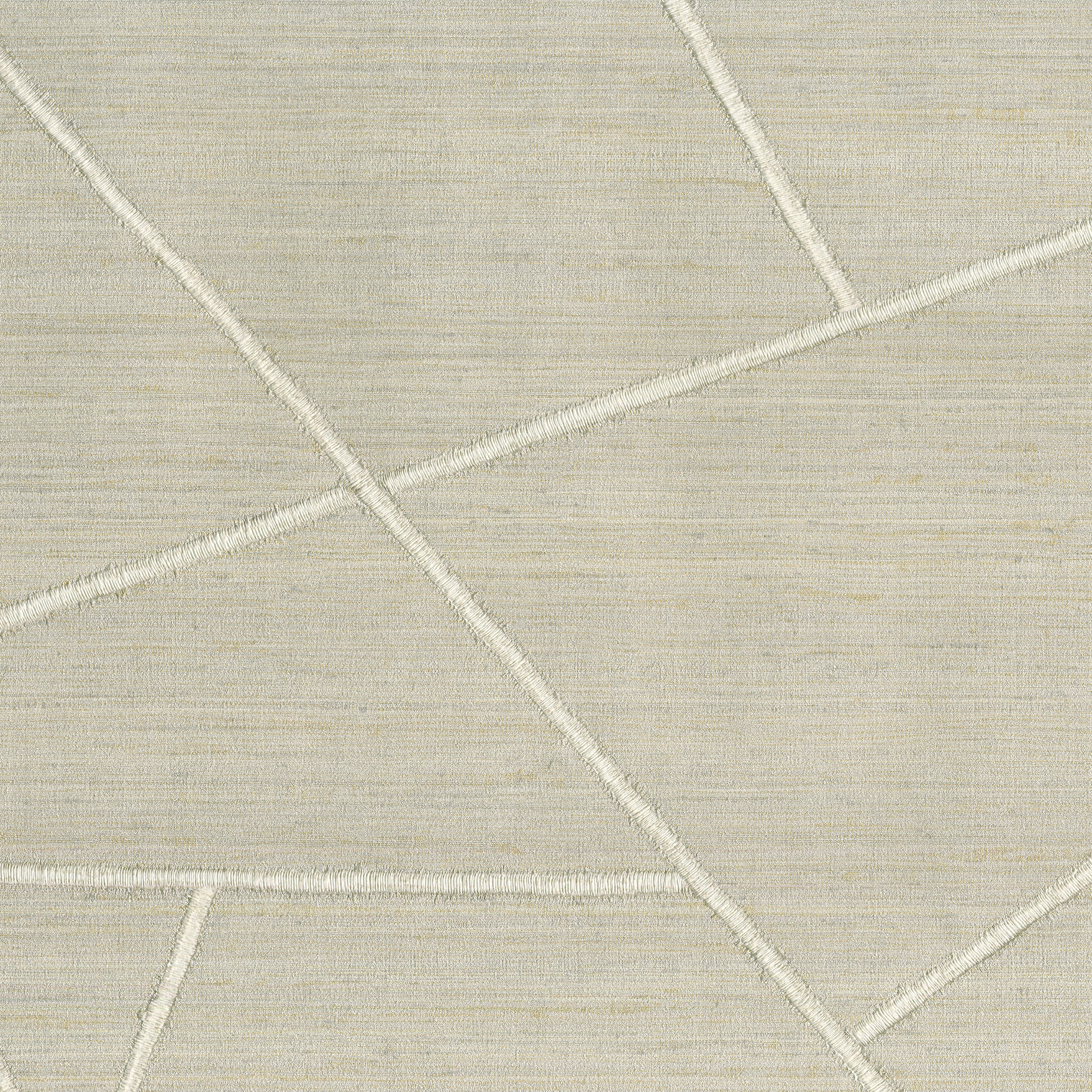 A vinyl substrate wallcovering with an embossed oversized geometric design giving the appearance of embroidered fabric. In a taupe and off-white coloration.
