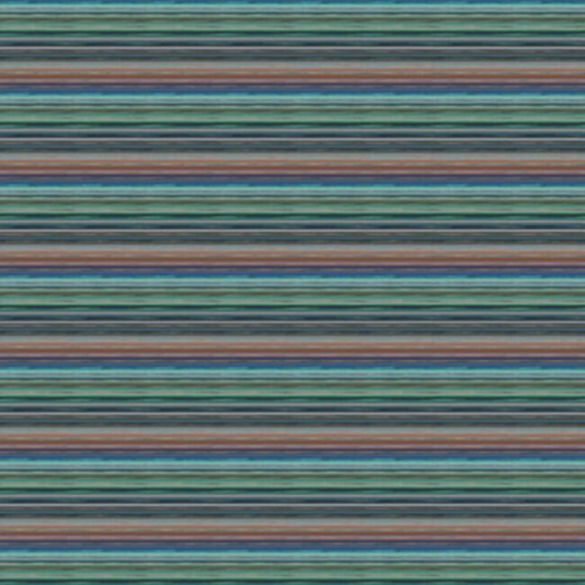 A Missoni Home multi colored metallized horizontal striped wallpaper mural in hues of green, blue, teal, purple, apricot and black.