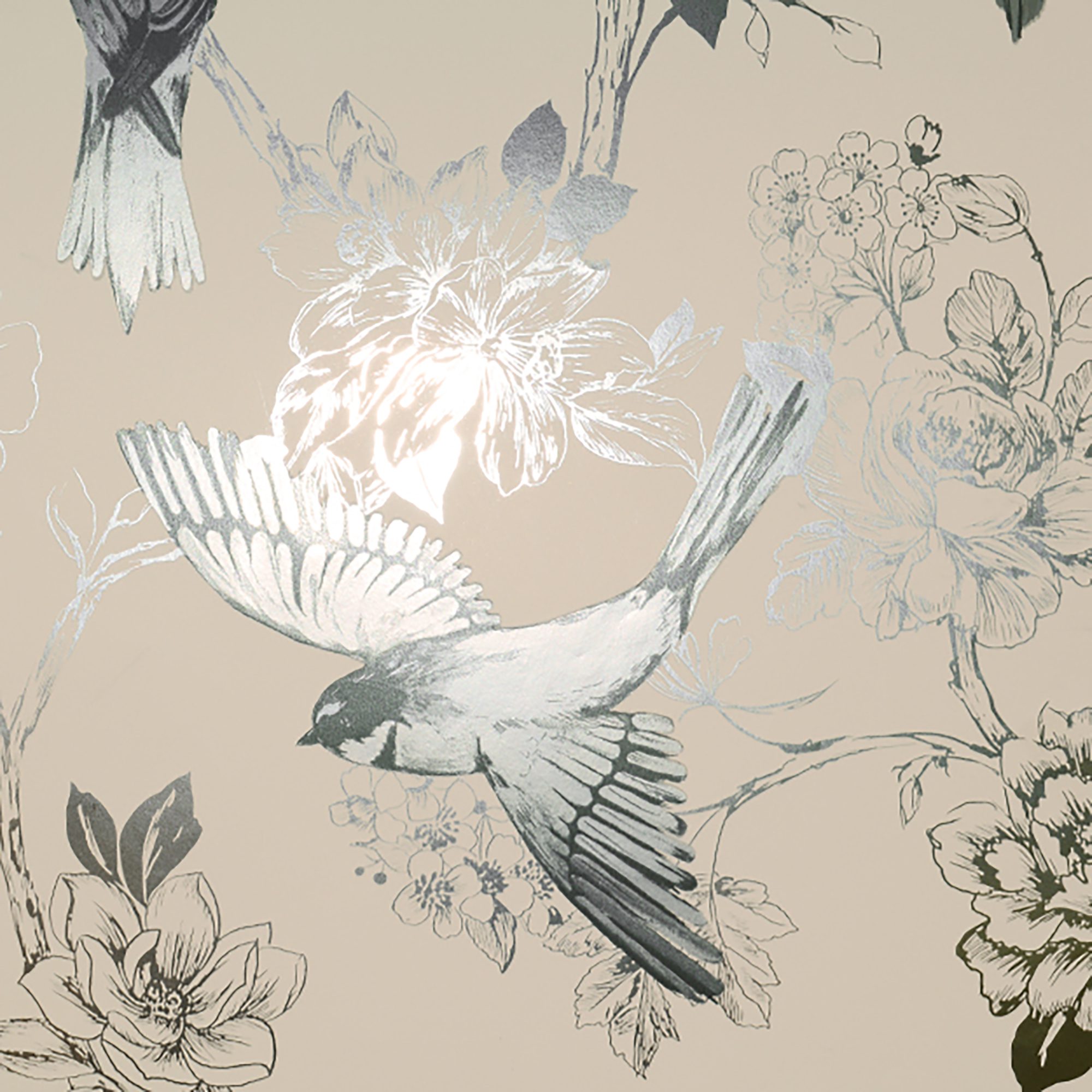 Traditional floral vine design foil wallpaper, soft gray ground with songbirds in flight and perched on a branch in shimmering siliver and gold tones.