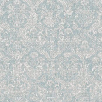 This wallpaper features a beautiful muted damask pattern in a shimmering white on a soft turqoise backing.