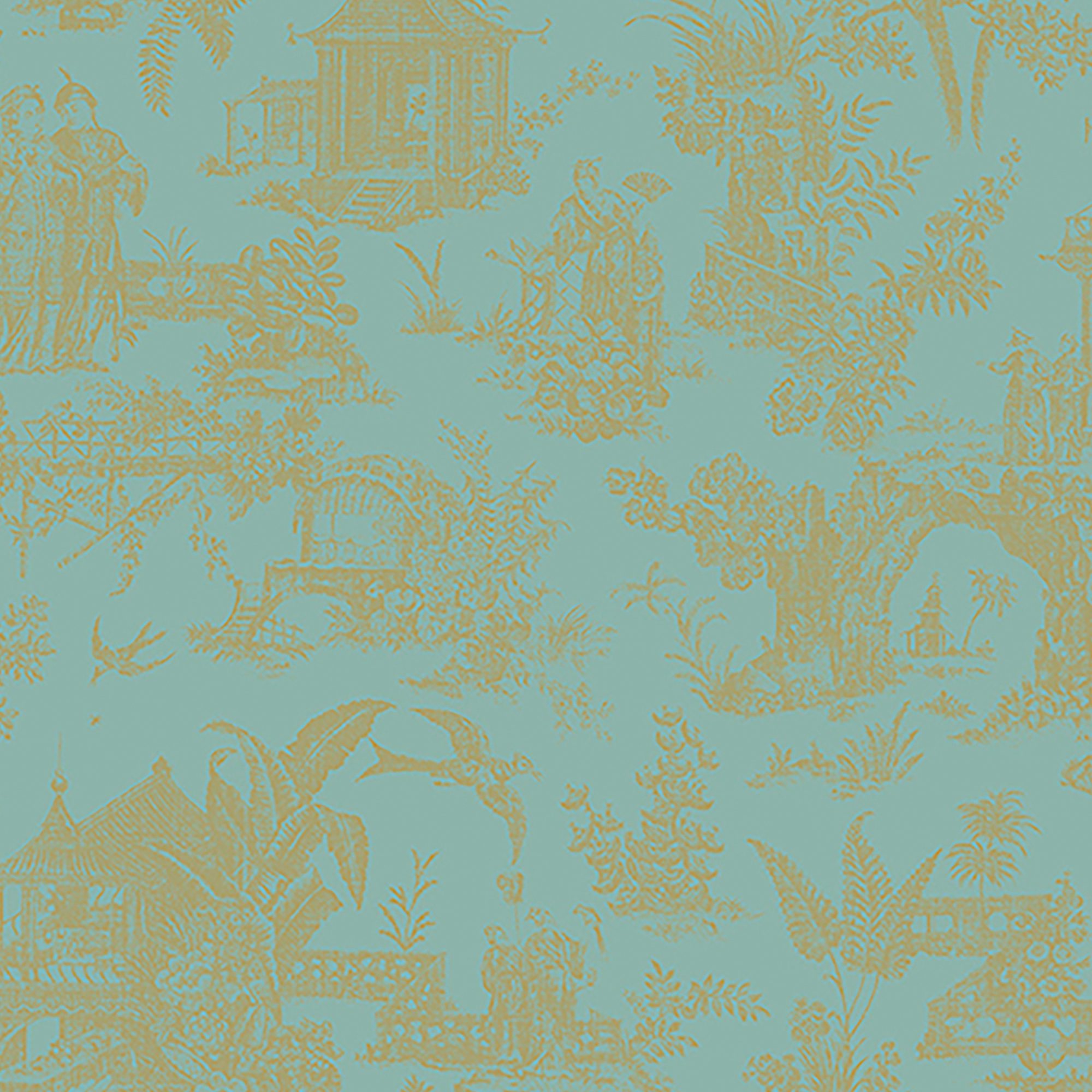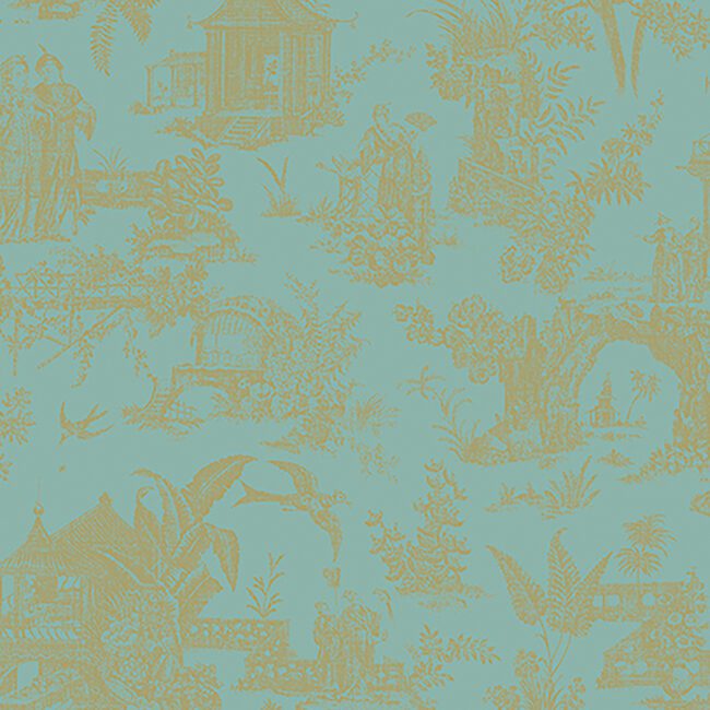 This oriental toile wallpaper is featured in a shimmering bronze on a turqoise backing.