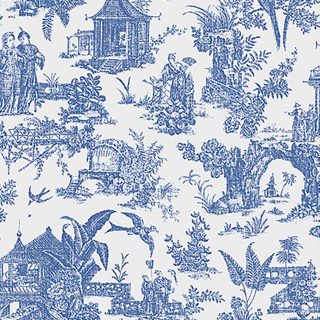 This oriental toile wallpaper is featured in indigo on a crisp white backing.