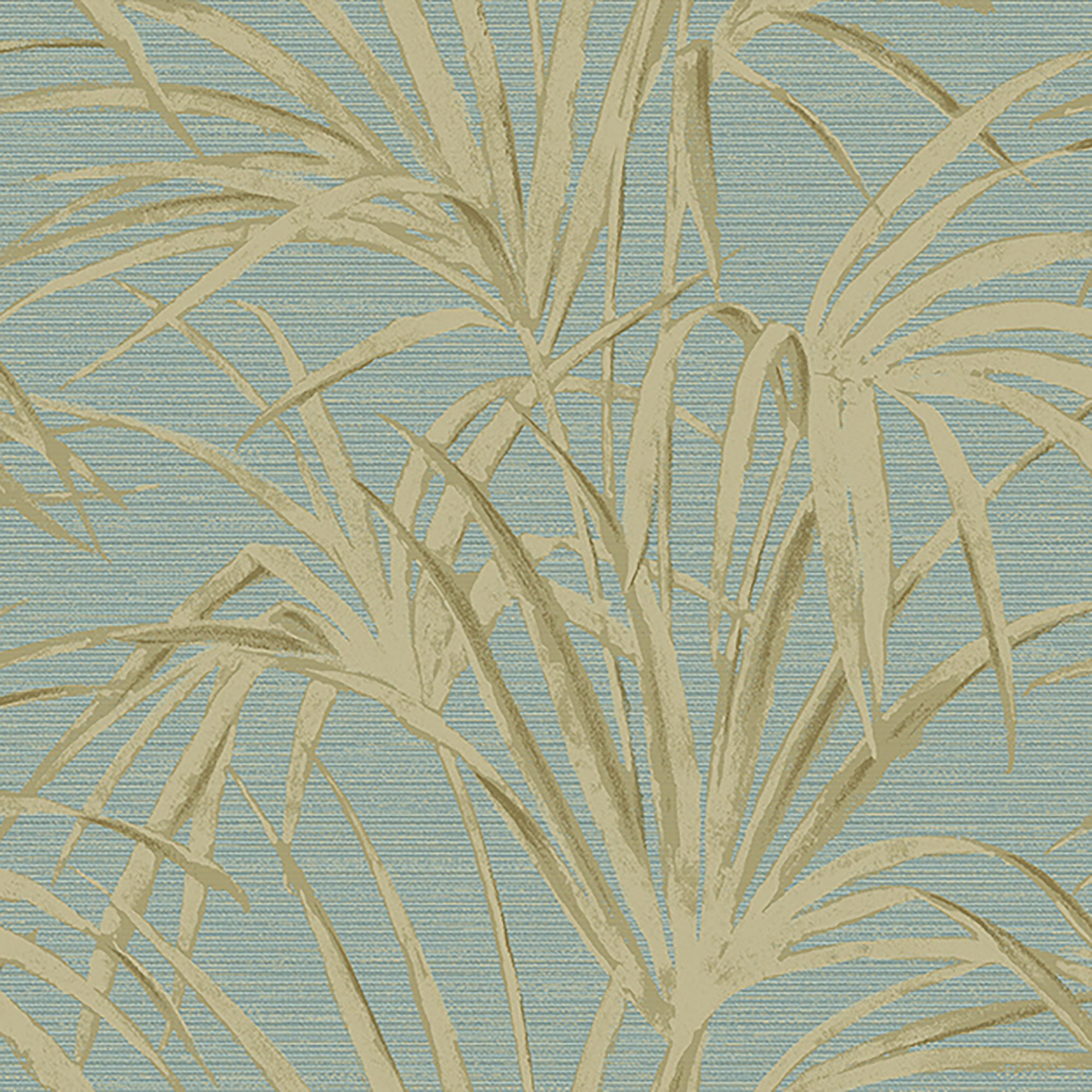 This textured wallpaper features large scale palm leaves in shimmering green and gold tones on a faux grasscloth, blue and taupe, background.