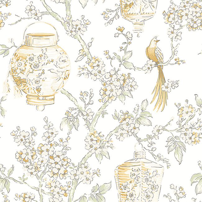 This wallpaper has a beautiful oriental flare. Pops of yellow are used throughout the magnolia tree's flowers, hanging lanterns, and birds, on a white backing.