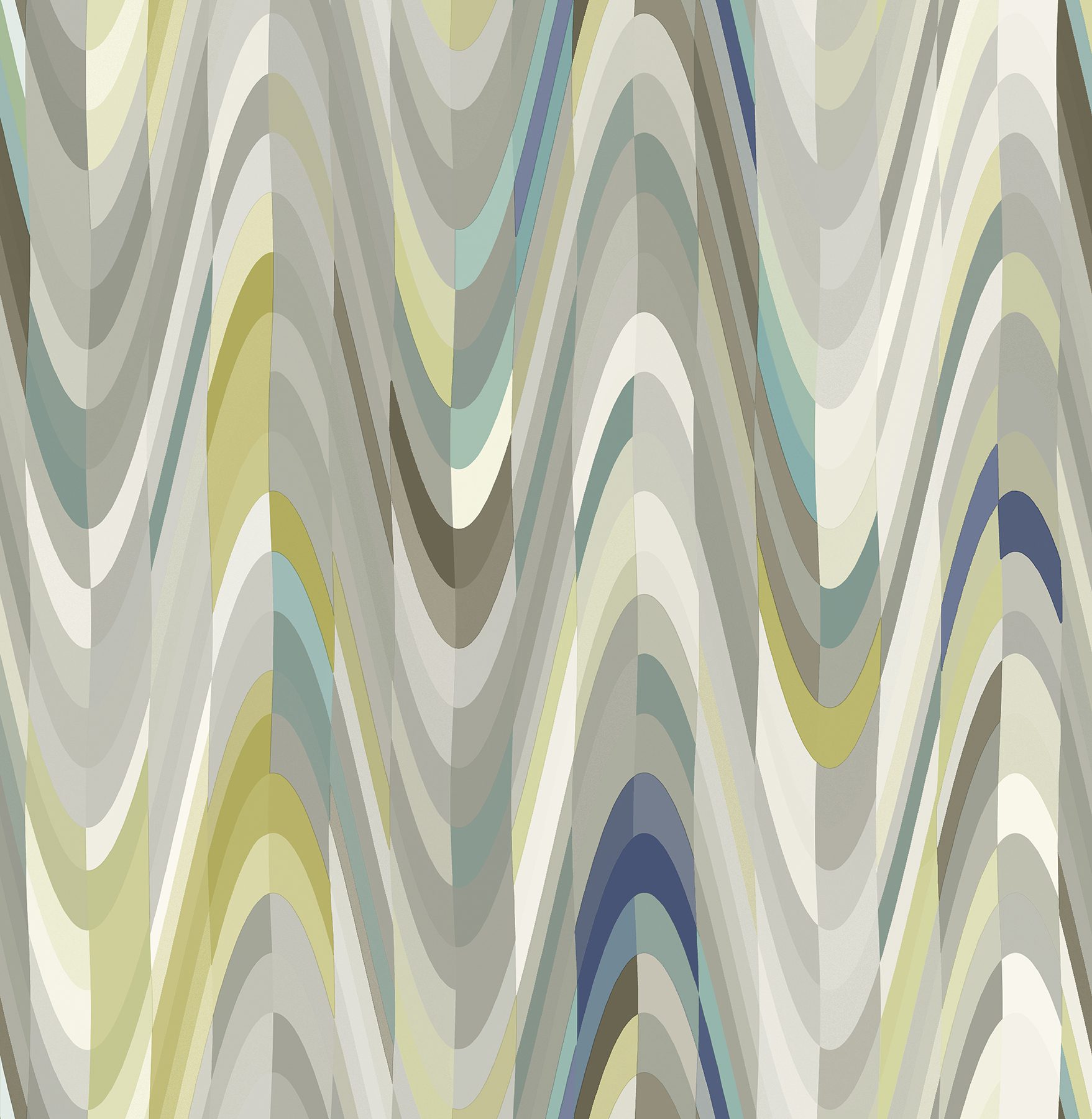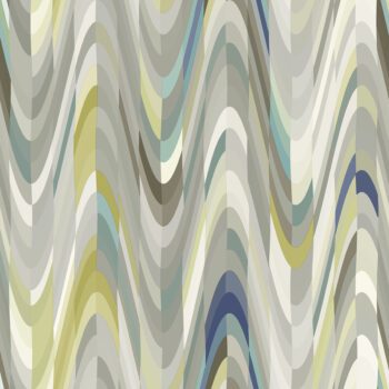 A funky abstract stripe design wallpaper, featuring multi hues of grey, lime green, spa blue, indigo and ivory.