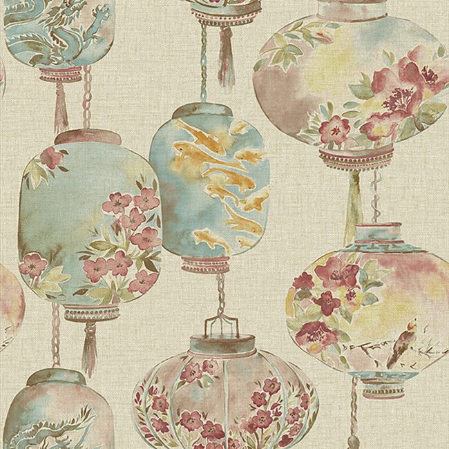 This wallpaper features beautiful large scale oriental lanterns in tones of pale reds, blues, greens, oranages, and yellows on a soft taupe backing.