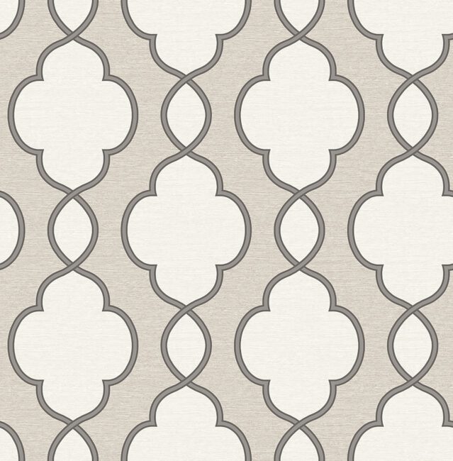 An uplifting contemporary ogee design wallpaper in cream and grey with shimmering metallic silver coloration.