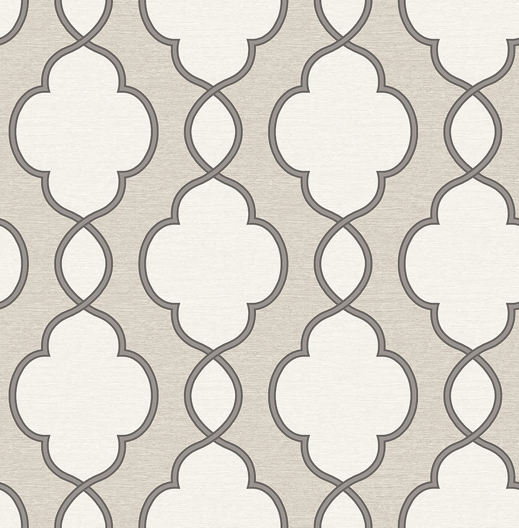An uplifting contemporary ogee design wallpaper in cream and grey with shimmering metallic silver coloration.
